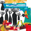 Wander Out Yonder Series: This series has been created using painted paper collage. Fi first creates a mixture of colours and textured papers and then hand cuts the shapes, free hand, constructing the subjects from memory and sketchbook observations. She uses reference book photographs to correctly observe the birds she is studying. The original images are photographed and then reproduced.